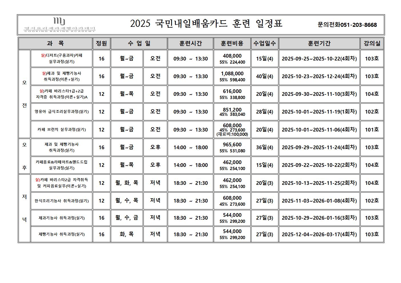 2025 국민내일배움카드 훈련일정표(9,10월)