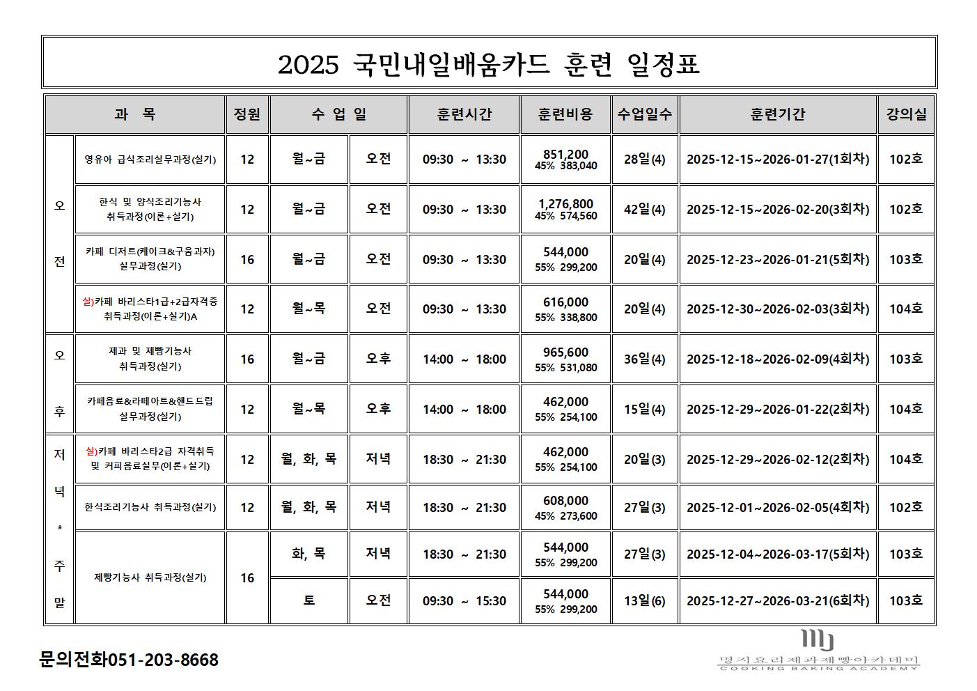 '명지요리' 검색하시면 저희 학원에 수강 가능한 훈련일정목록이 나올거에요~