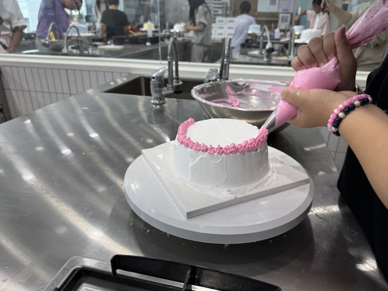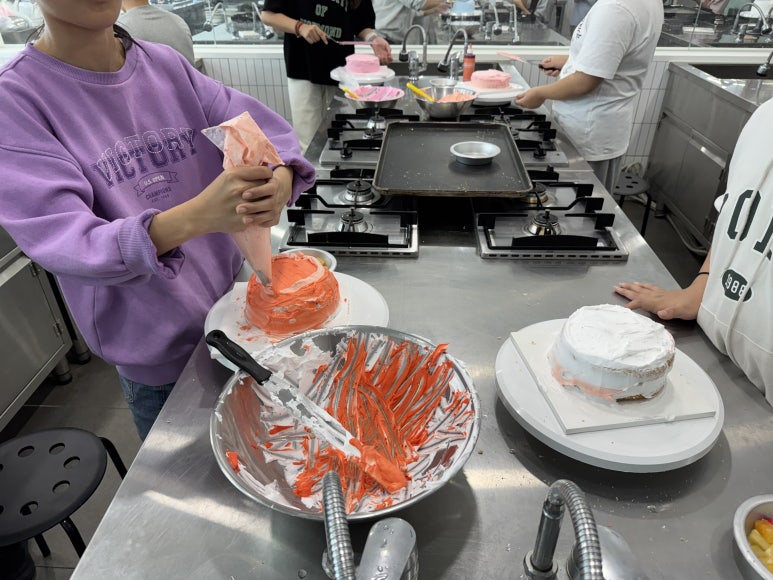 원하는 식용 색소를 넣어 색을 만들고 각자의 방법대로 생크림을 바릅니다.