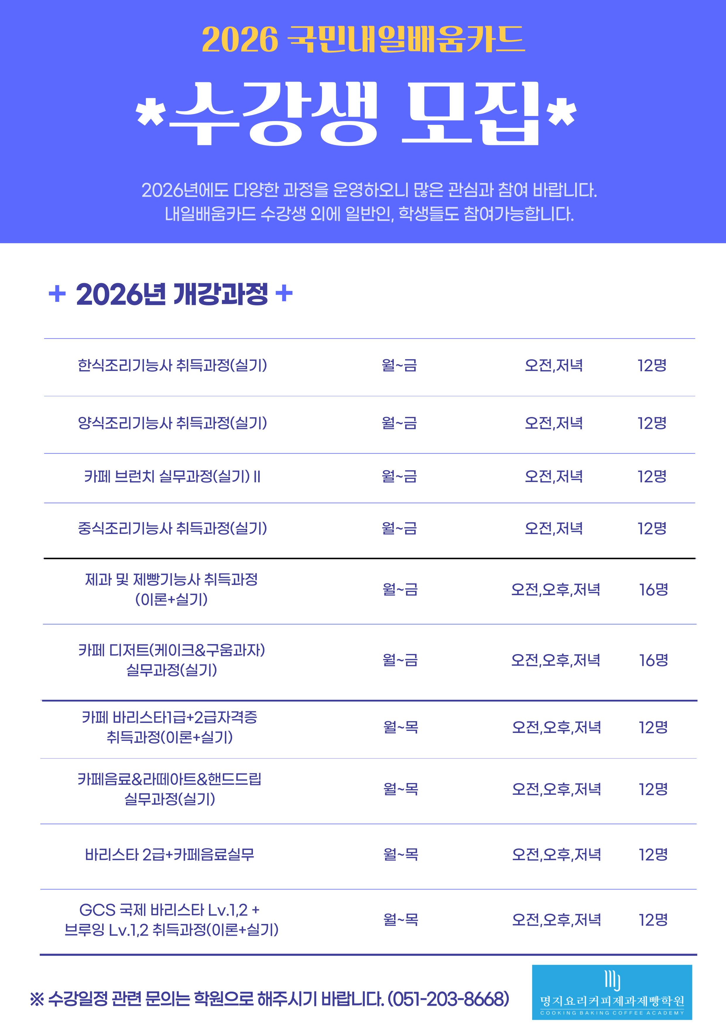 2026년 명지요리커피제과제빵학원 훈련과정 안내
